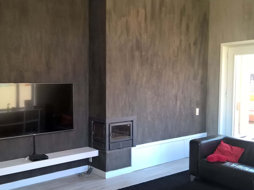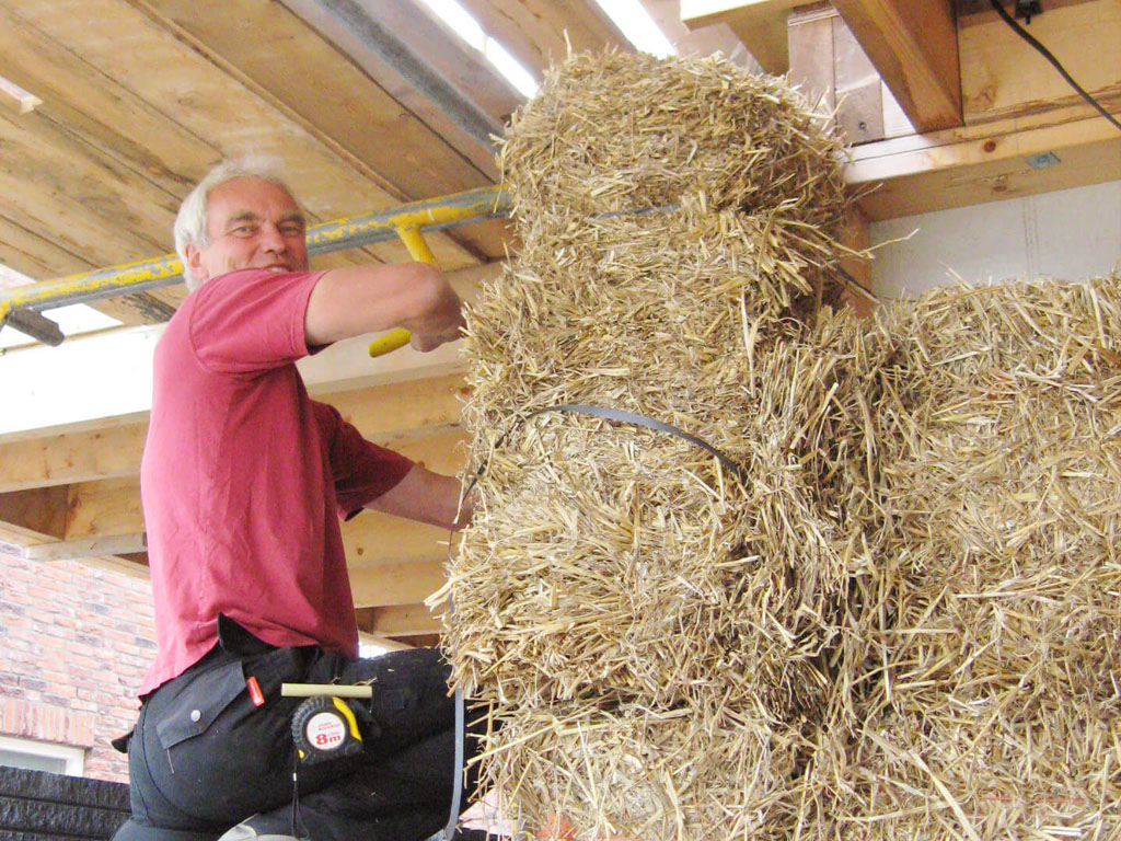- Dikke strobalen muren, afgewerkt met dampopen kalkstuc in een karakteristieke metselsteenrode kleur aan de buitenzijde en leemstuc aan de binnenzijde.