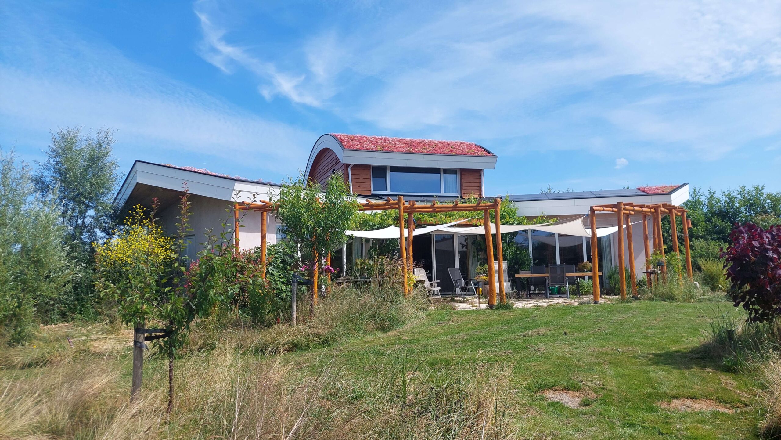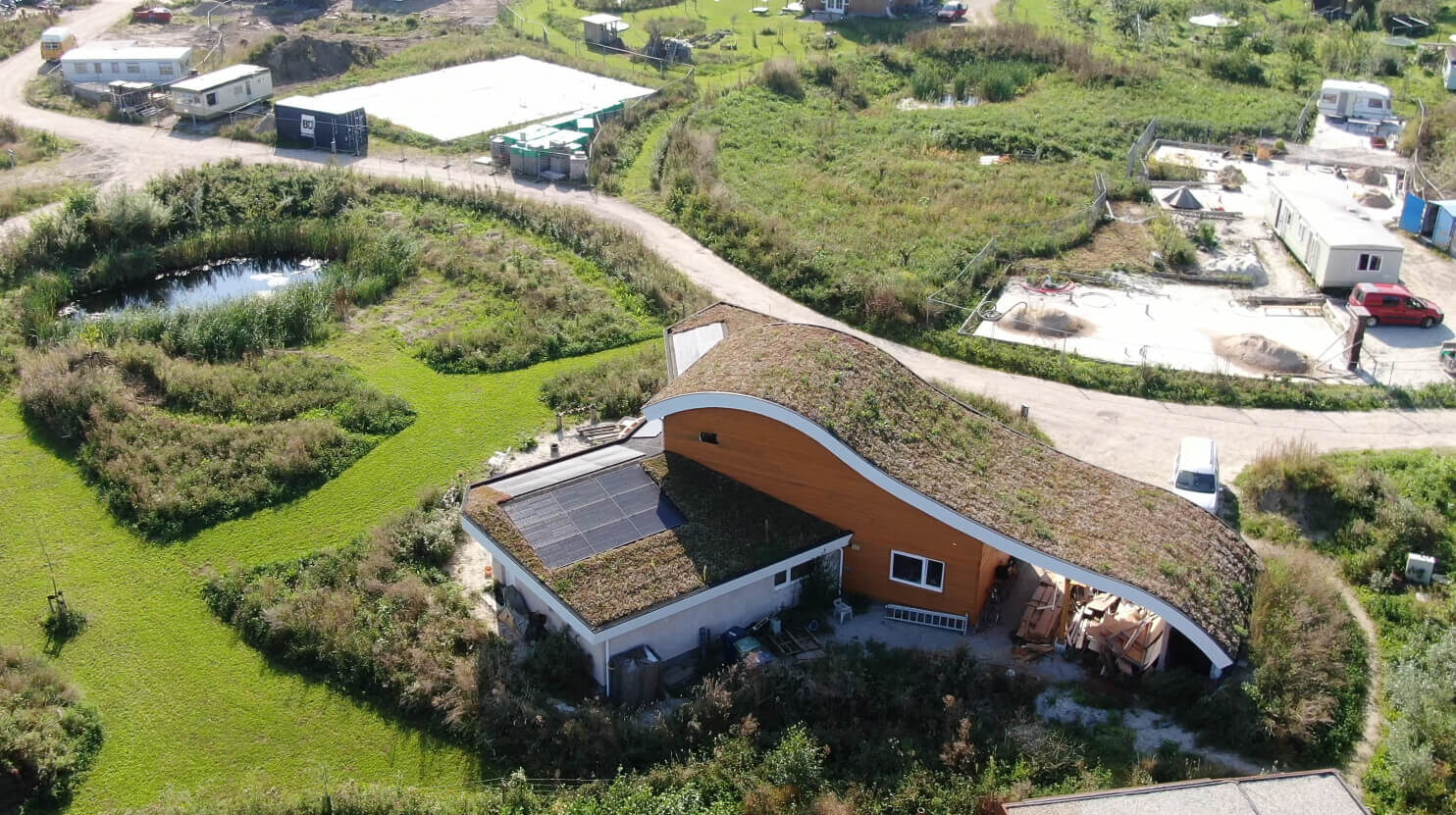 Midden in het vrije landschap van Almere Oosterwold staat De Groene Draak, een woning die volledig is opgebouwd vanuit de geometrie van de Flower of Life. Dit oeroude patroon vormt niet alleen de basis van de plattegrond, maar is doorgevoerd in elk detail – van de vorm van de woning tot de bestrating en de pergola. Het resultaat is een huis waarin alles in balans is, met een dynamische interactie tussen architectuur, natuur en energie.